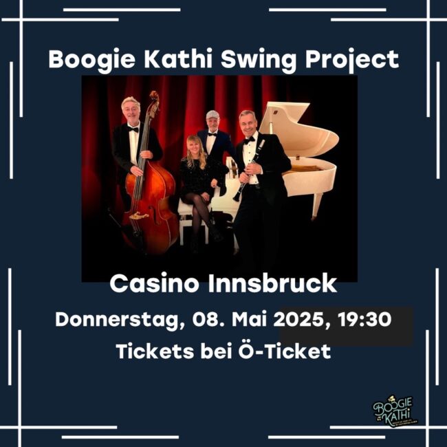 Christmas Boogie Night 9. Swingende Weihnacht 27.November 2025 20:00 Uhr Casino Innsbruck Tauchen Sie ein in die festliche Stimmung der Vorweihnachtszeit und erleben Sie eine „Swingende Weihnacht“ am 27. November 2025 im Casino Innsbruck! Freuen Sie sich auf ein cooles, weihnachtliches Programm voller Boogie Woogie, Blues, Swing und Dixieland: Boogie Kathi & the Muddy Bluesmen…