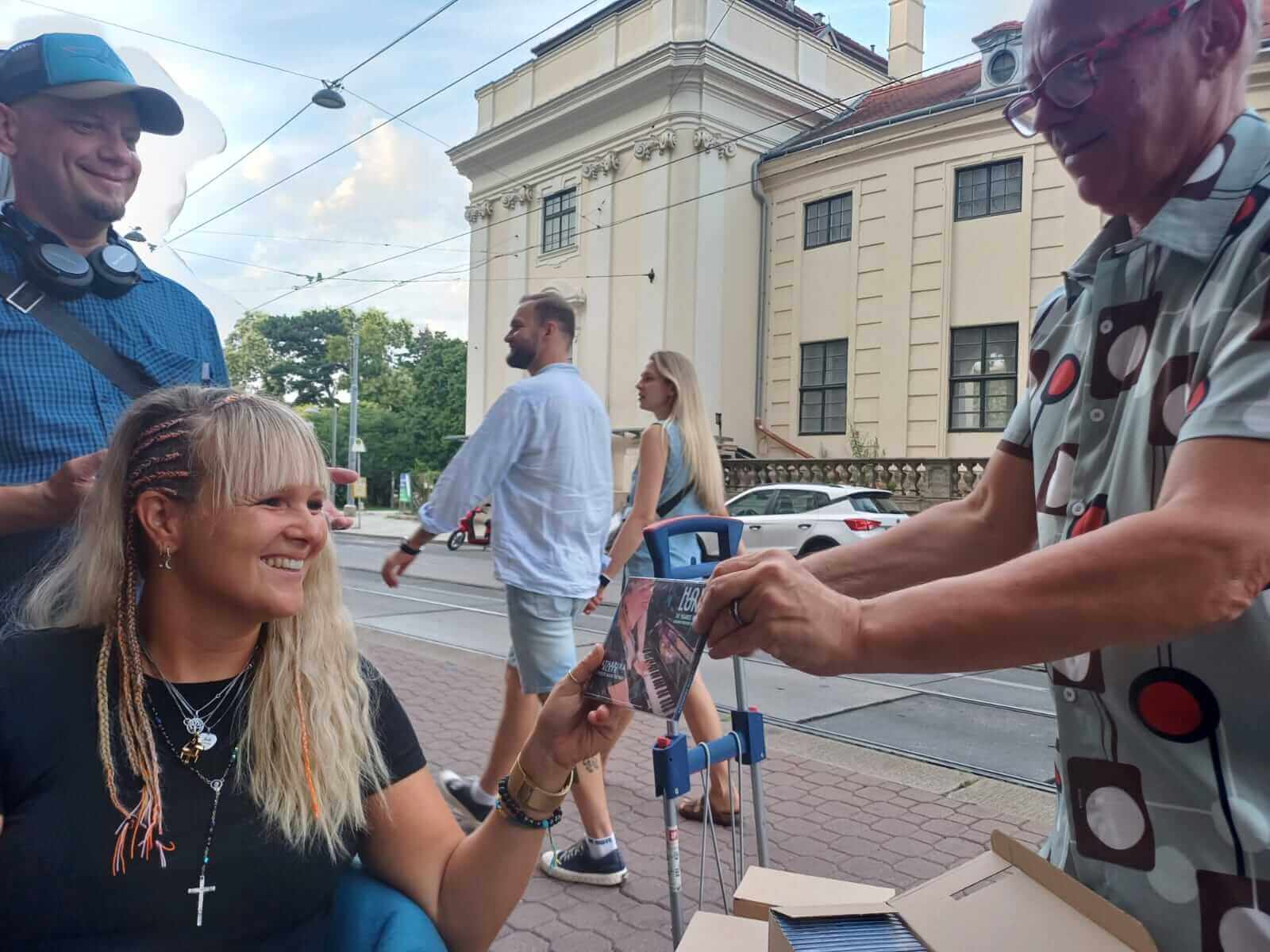 Die Anreise war ursprünglich gemütlich mit dem Zug geplant, doch aufgrund eines Systemausfalls hatten alle Züge erheblich Verspätung. Notgedrungen entschieden wir uns, das Auto zu nehmen. Ich holte Tom ab und gemeinsam machten wir uns auf die fünfstündige Fahrt nach Wien. Wir kamen buchstäblich in letzter Minute an – zehn Minuten vor dem Auftritt – und schafften es gerade noch, unsere Instrumente aufzubauen.
